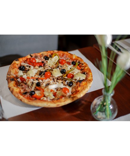 Découvrez notre pizza 4 saisons à Gif-sur-Yvette, une recette italienne classique et savoureuse composée de jambon, champignons, artichauts et olives, répartis harmonieusement sur une pâte artisanale croustillante.