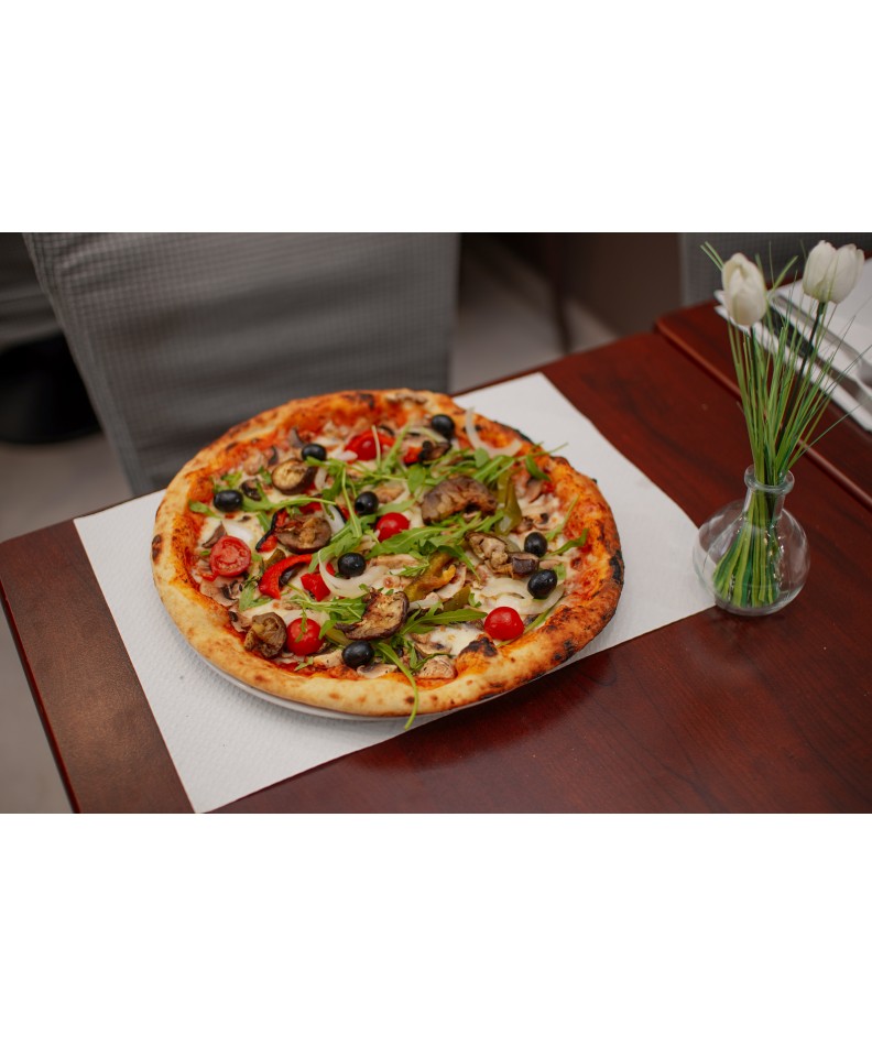 Découvrez notre Pizza Végétarienne à Gif-sur-Yvette, une recette fraîche et savoureuse composée de poivrons grillés, champignons, oignons, olives noires et tomates fraîches sur une base de sauce tomate et une pâte artisanale croustillante.