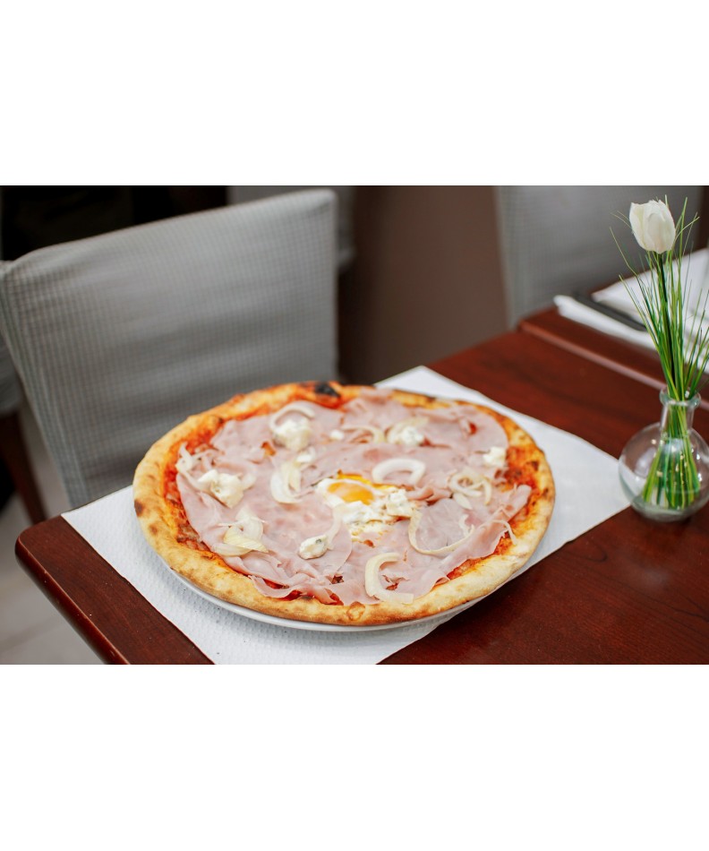 Découvrez la pizza Venezia à Gif-sur-Yvette, une création gourmande et généreuse composée de mozzarella fondante, de gorgonzola crémeux, de jambon savoureux, d’un œuf frais et d’oignons, le tout sur une base de sauce tomate et une pâte artisanale croustillante.