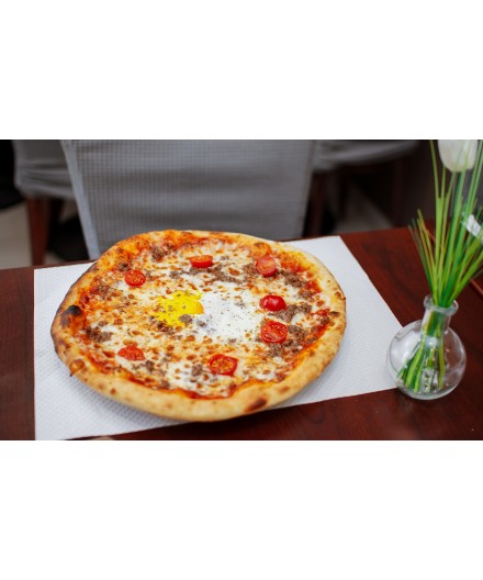 Découvrez la pizza Del Capo à Gif-sur-Yvette, une création gourmande et généreuse composée de viande hachée savoureuse, de mozzarella fondante, d’un œuf frais et de tomates cerises sur une base de sauce tomate maison.